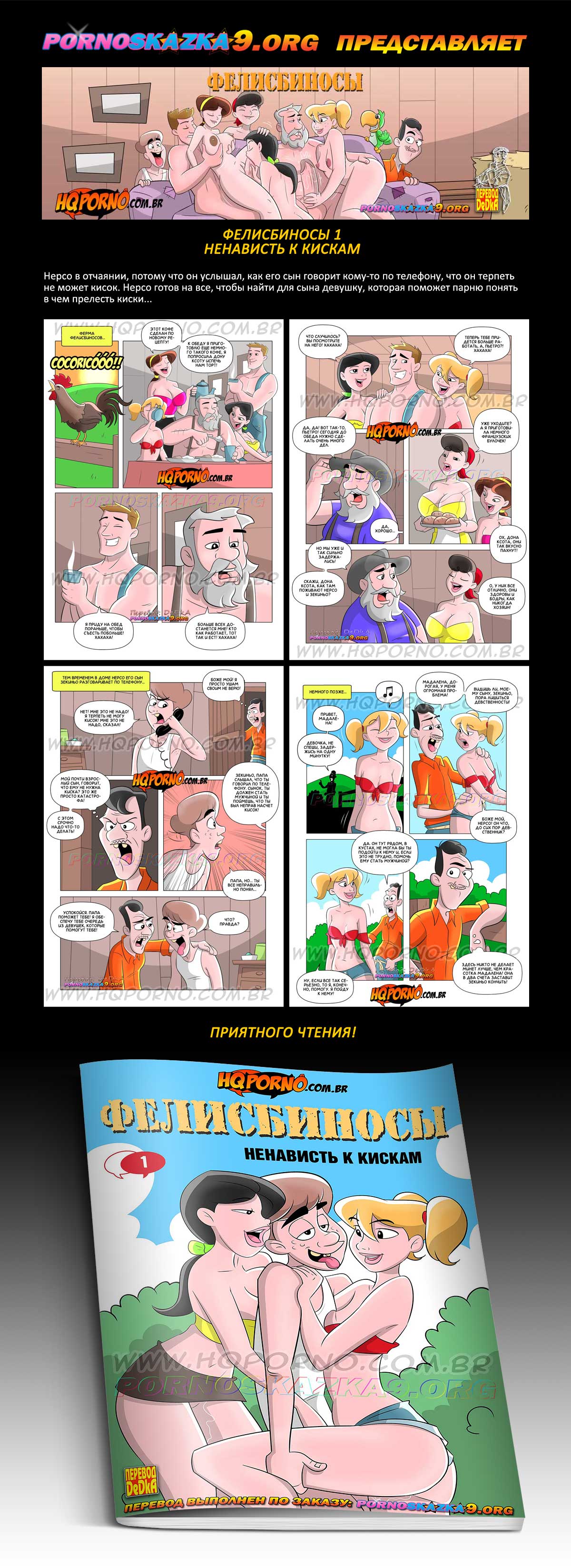 Порно комикс «Фелисбиносы. Часть 1. Ненависть к кискам.» Нерсо в отчаянии, потому что он услышал, как его сын говорит кому-то по телефону, что он терпеть не может кисок. Нерсо готов на все, чтобы найти для сына девушку, которая поможет парню понять в чем прелесть киски…